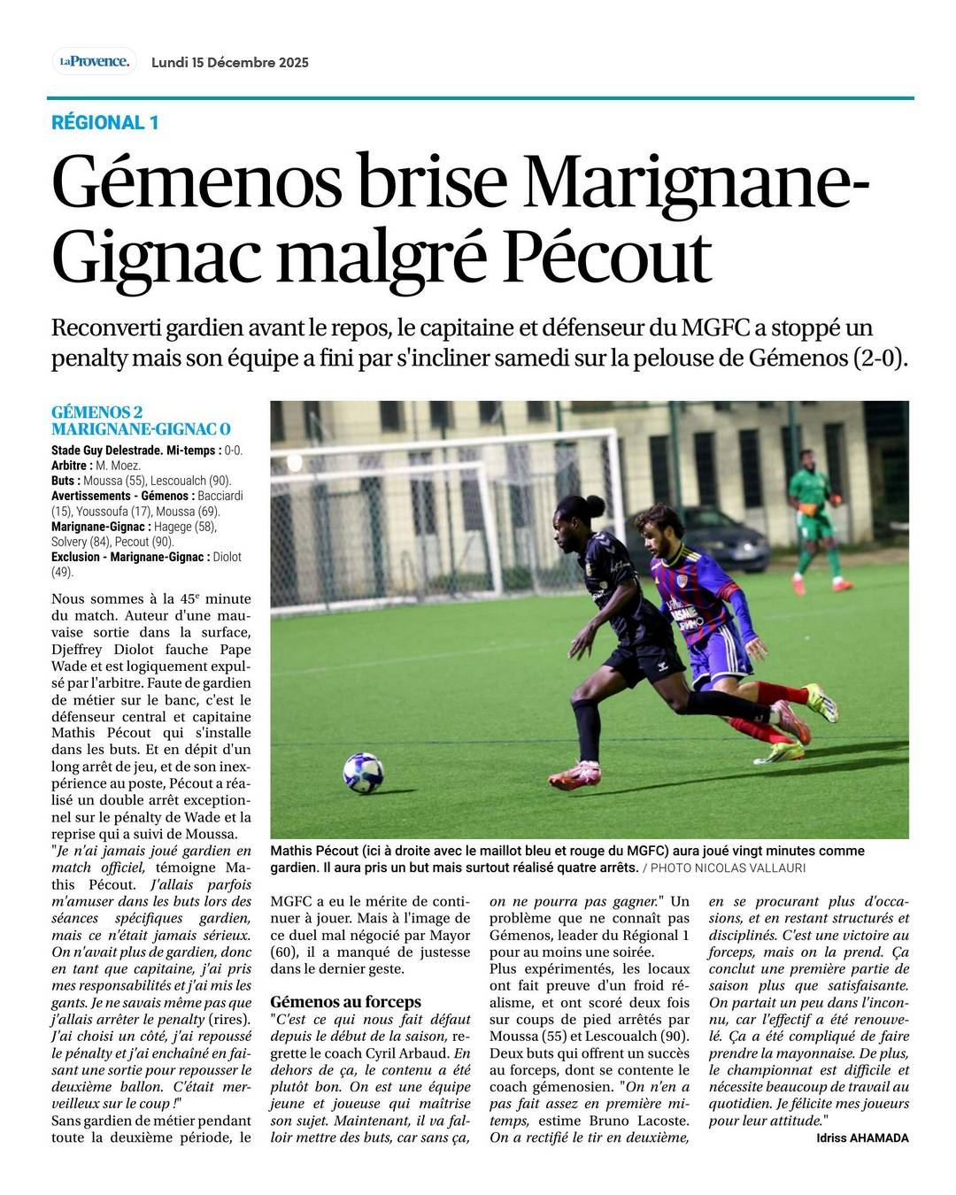 Article paru lundi dans la Provence après la défaite à Gémenos et la reconversion de notre capitaine Mathis PECOUT en gardien de but après le carton rouge de DIOLOT.