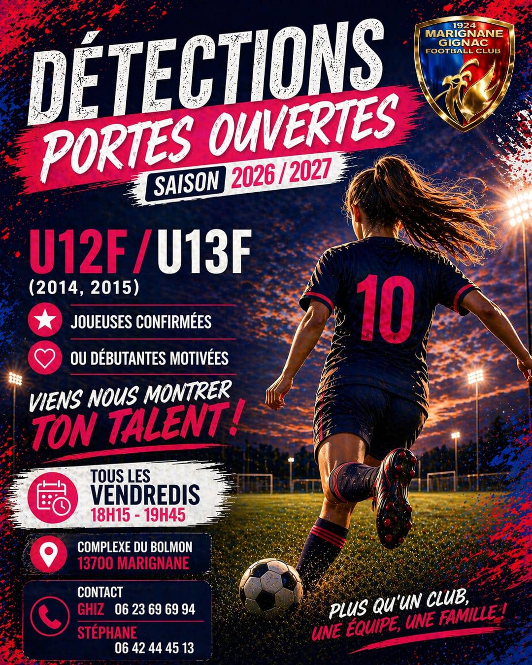 Dans le cadre de son développement et de la structuration de sa filière féminine, le Marignane Gignac Football Club organise ses détections et portes ouvertes en vue de la saison 2026/2027.