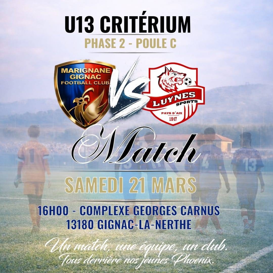 Ce samedi 21 mars à 16h00, les jeunes Marignanais disputeront leur 3ᵉ match de la phase 2 face à Luynes Sports, au complexe Georges Carnus à Gignac-la-Nerthe.